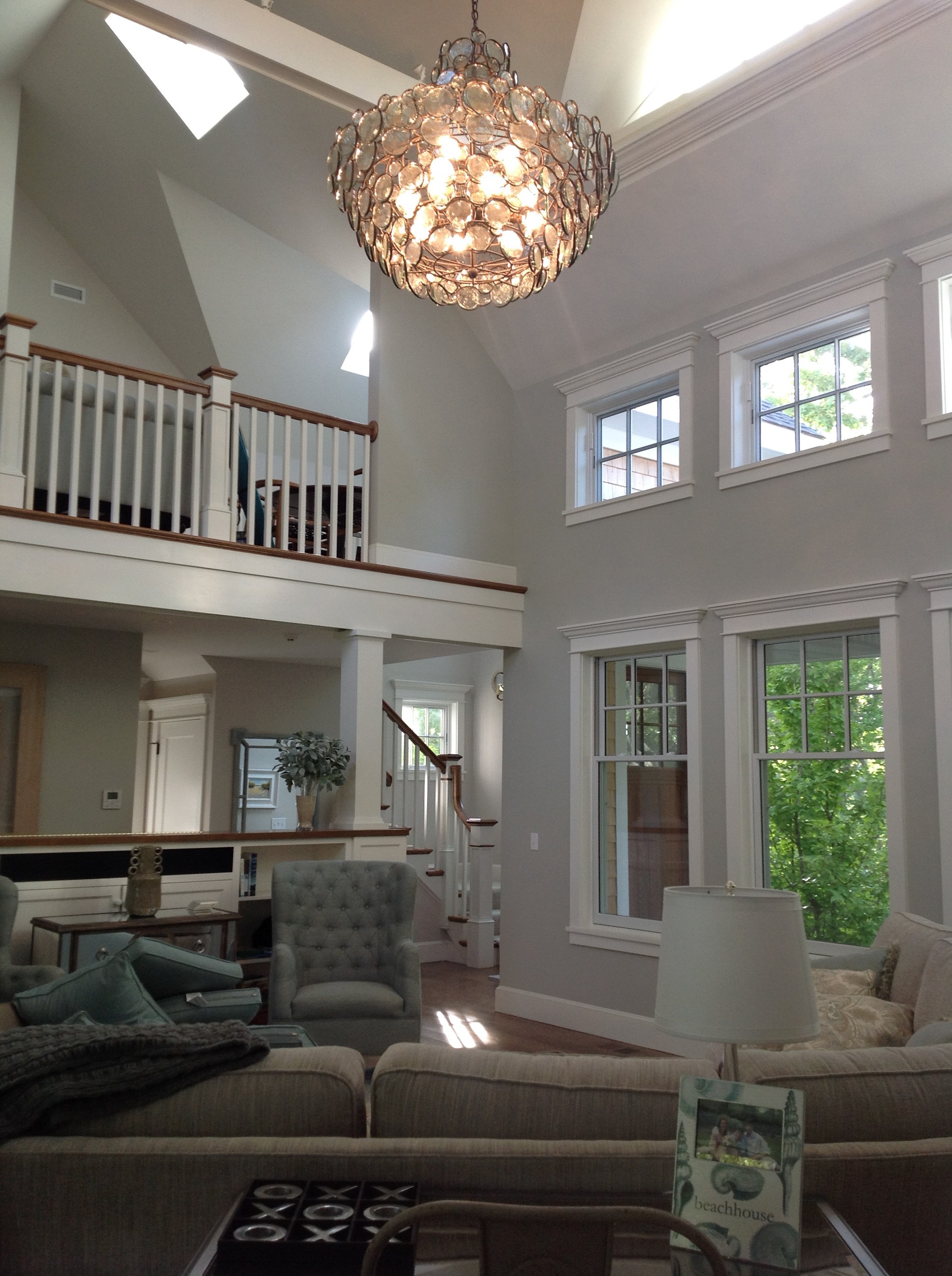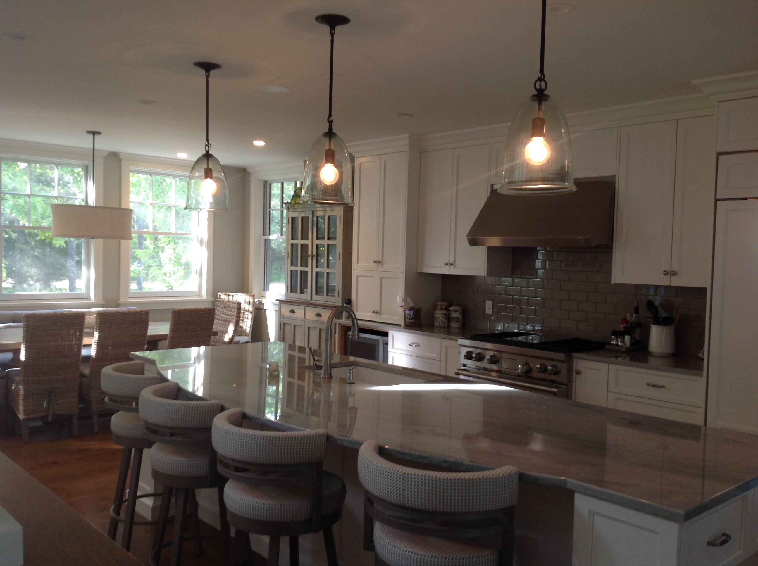 The beautiful spaces in this home now features a transitional recycled glass chandelier, transitional recycled glass kitchen pendants, and more.